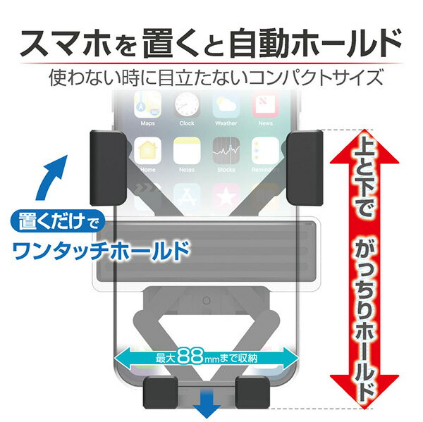 ●スマホを差込むと自重でアームが閉じてホールドし、スマホを取出すとアームが閉まるオート開閉スマホホルダー。